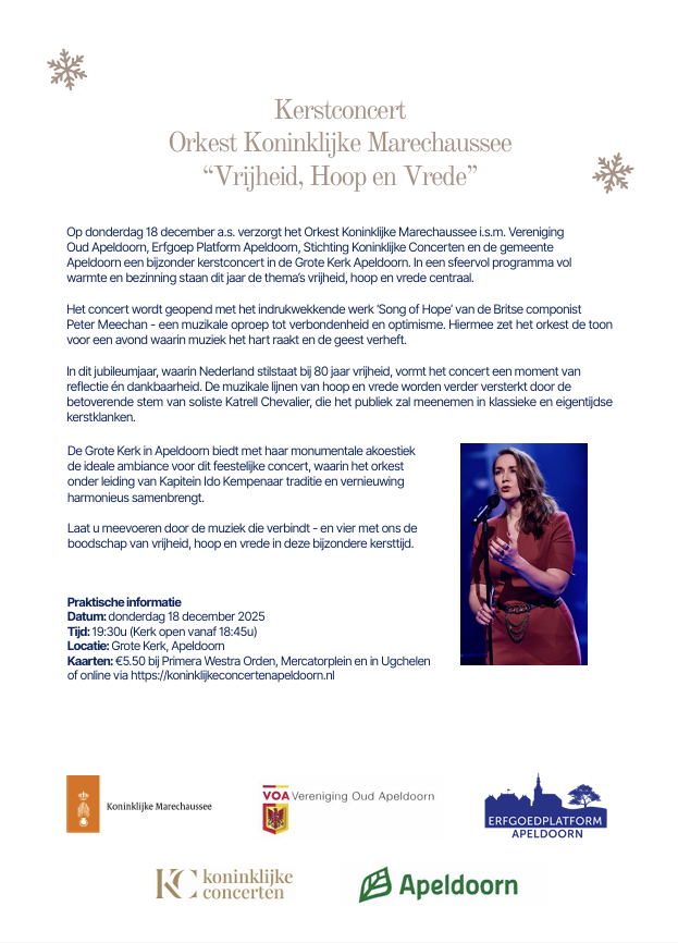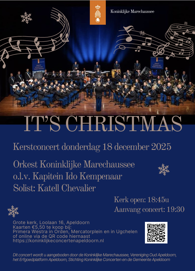 18 december 2025Het Kerstconcert in de Grote Kerk – in samenwerking met Vereniging Oud Apeldoorn, Erfgoedplatform Apeldoorn, gemeente Apeldoorn en natuurlijk het Orkest Koninklijke Marechaussee.